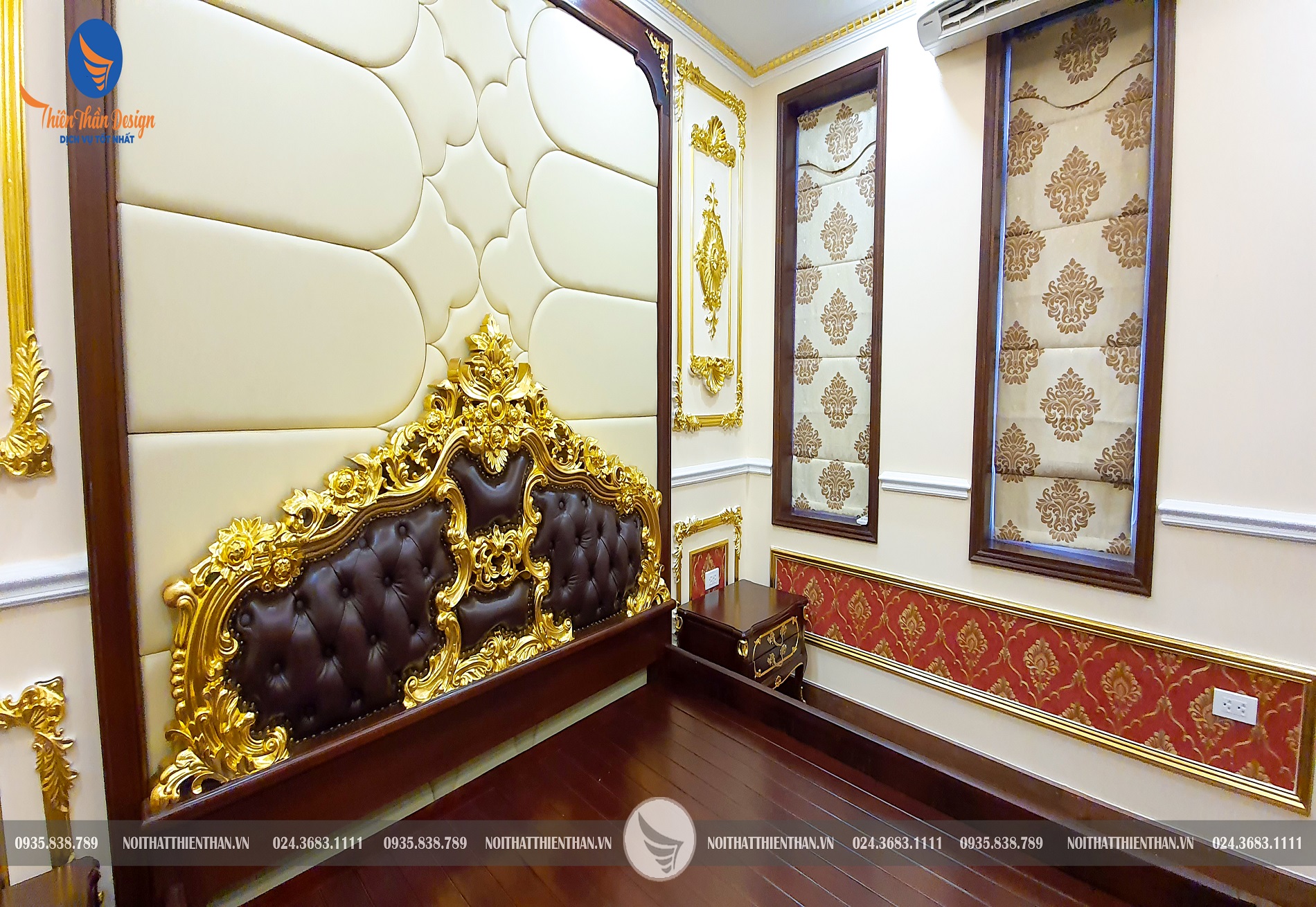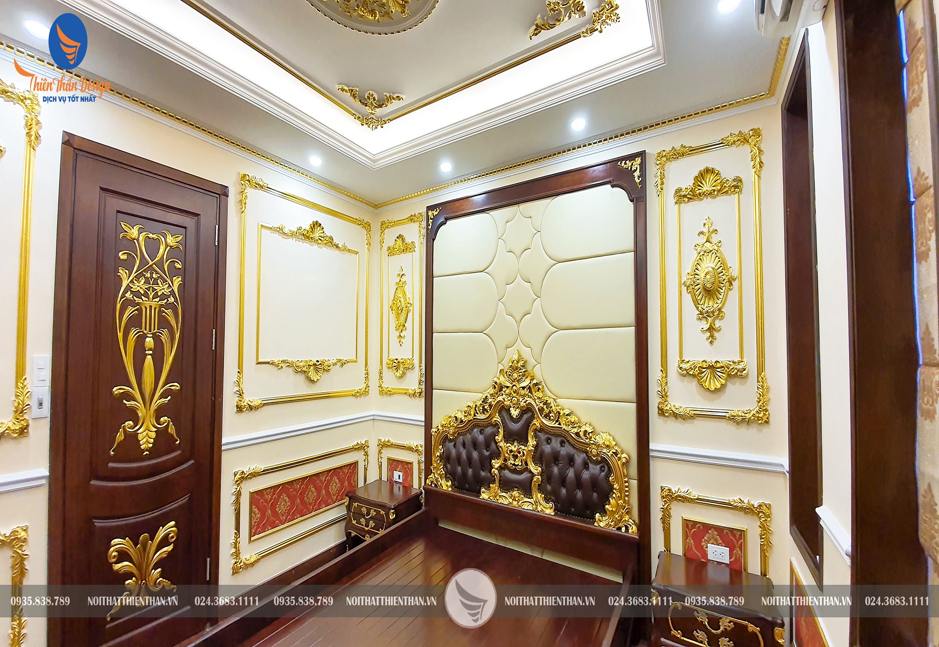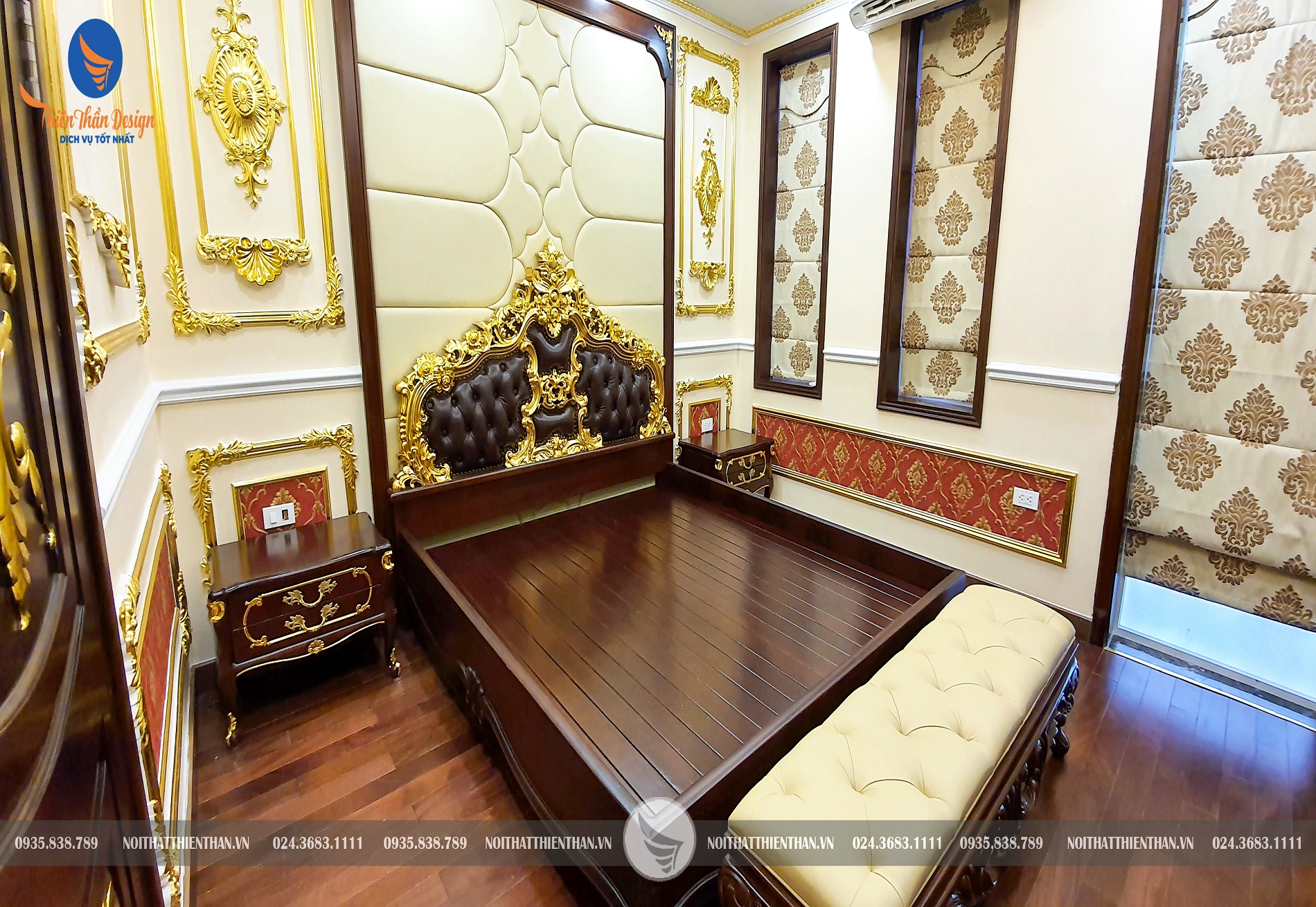 Không gian nhà phố này cũng vậy. Với tiêu chí tạo sự sang trọng, yên tĩnh, đầy cá tính riêng của chủ nhân, chúng tôi đã chọn lựa các vật liệu xa xỉ, đắt đỏ để thi công hoàn thiện nó. Ví dụ như gỗ gõ đỏ ở mẫu giường, chi tiết mạ vàng ở đầu giường, tường, cạnh tủ,…