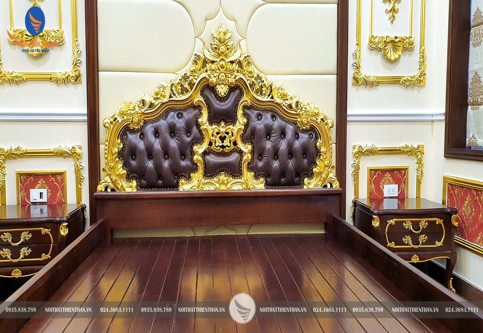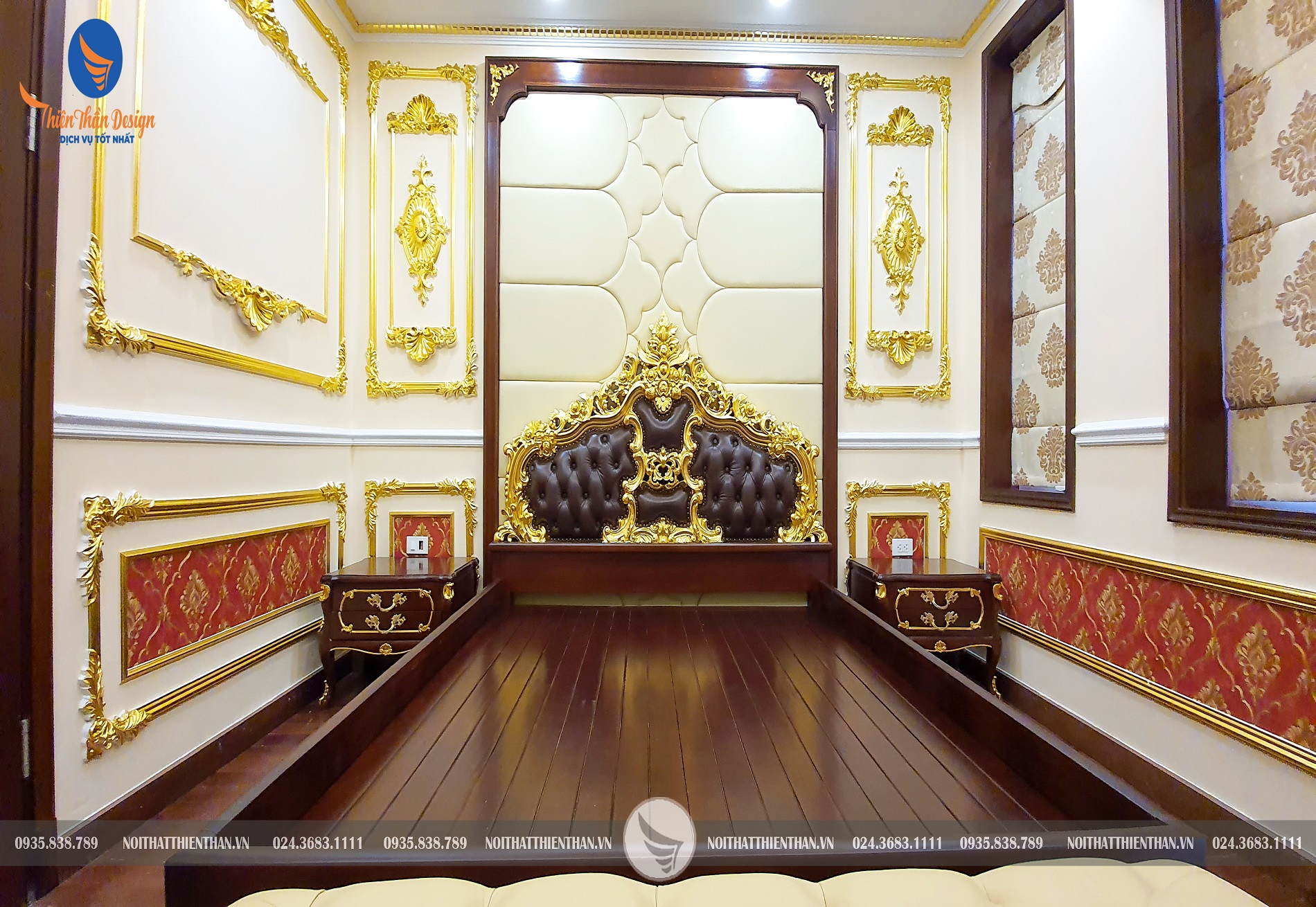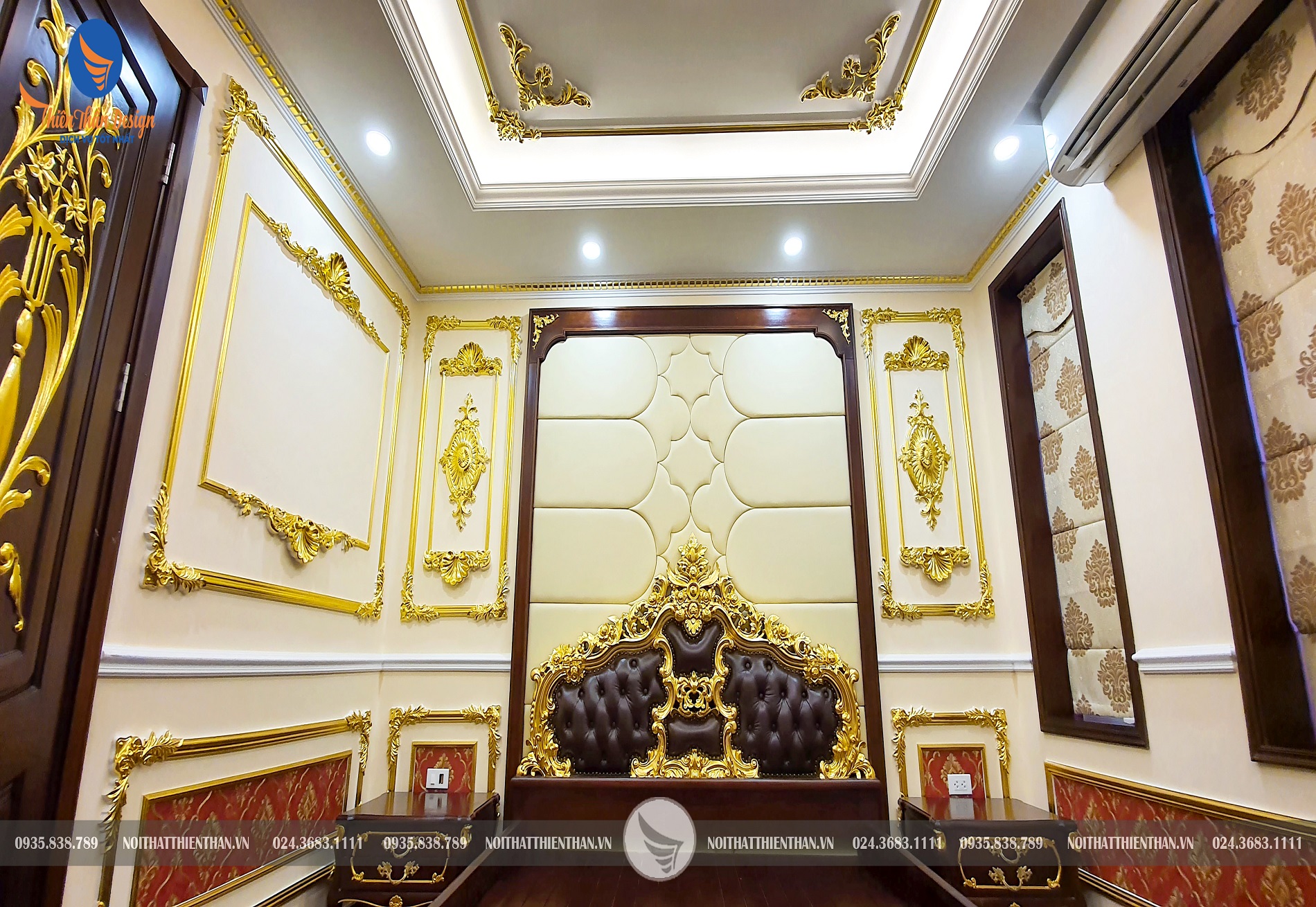 Không gian nhà phố này cũng vậy. Với tiêu chí tạo sự sang trọng, yên tĩnh, đầy cá tính riêng của chủ nhân, chúng tôi đã chọn lựa các vật liệu xa xỉ, đắt đỏ để thi công hoàn thiện nó. Ví dụ như gỗ gõ đỏ ở mẫu giường, chi tiết mạ vàng ở đầu giường, tường, cạnh tủ,…