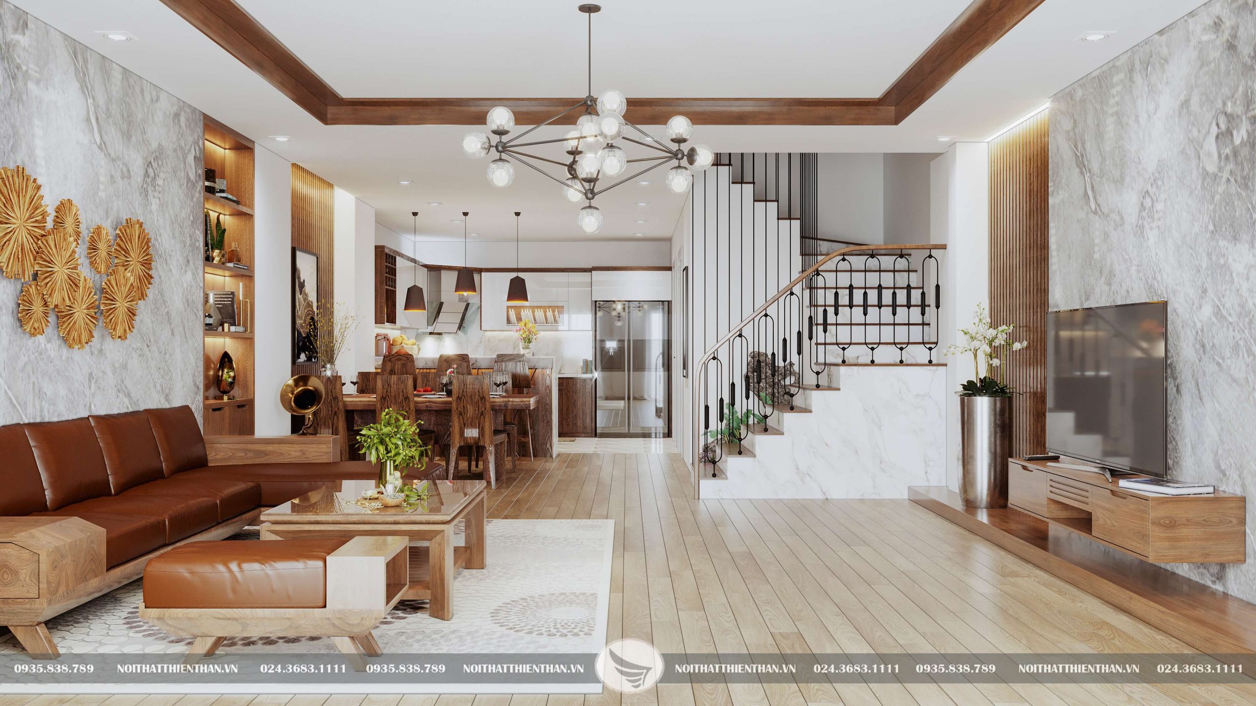 Bạn sẽ cảm nhận được sự thoáng đãng, không hề bí bách nhờ vào sự xuất hiện của kiến trúc liên thông khách bếp, những mẫu vách ngăn thông thoáng, không hề nặng nề lên không gian. Chưa hết nhé, bên cạnh đó là cách sử dụng và phối màu sắc hài hòa, độc đáo giúp cho căn nhà toát lên vẻ đẹp hiện đại sang chảnh nhưng cũng vô cùng gần gũi.