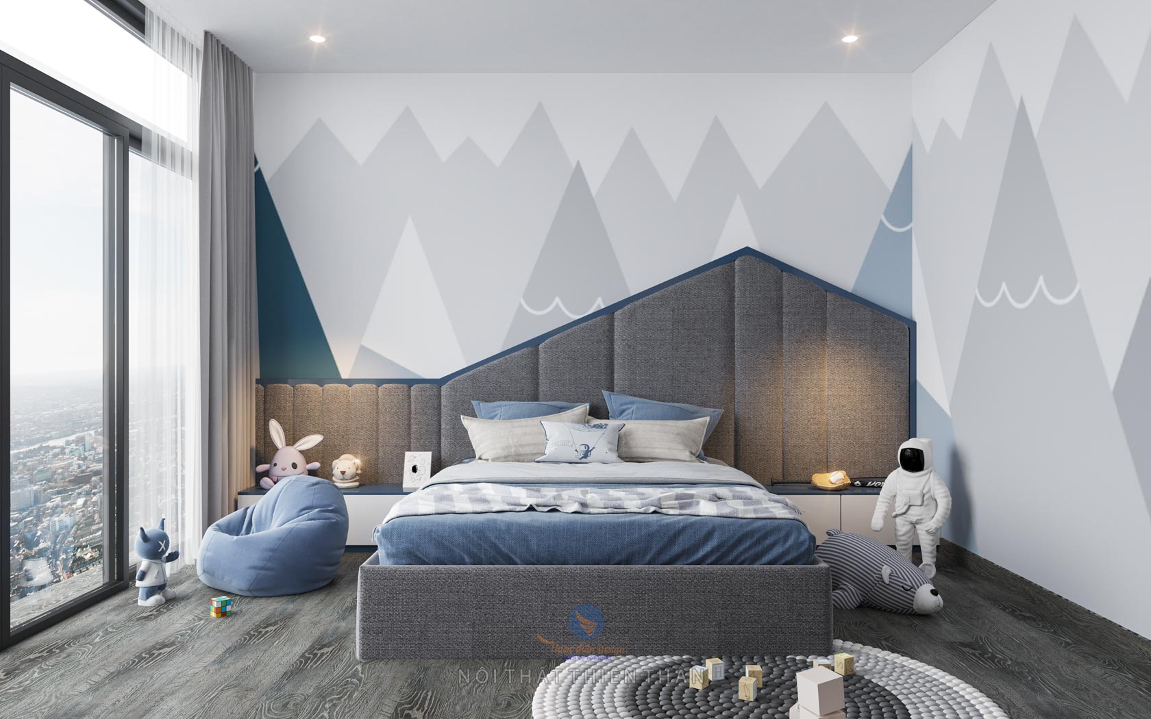 Phòng ngủ con trai của gia đình được thiết kế đơn giản hơn nhưng vẫn cực kì bắt mắt. Thiết kế dựa trên sở thích của côn trai yêu nhà mình là tone màu xanh dương nhẹ nhàng. Sàn và thành giường sử dụng màu xám tạo hiệu ứng nhẹ làm căn phòng trông trở nên ấm áp và hiện đại hơn. Phòng thiết kế thêm cửa kính trong suốt giúp căn phòng trông rộng rãi, thu hút được nguồn năng lượng tự nhiên vào nhà.