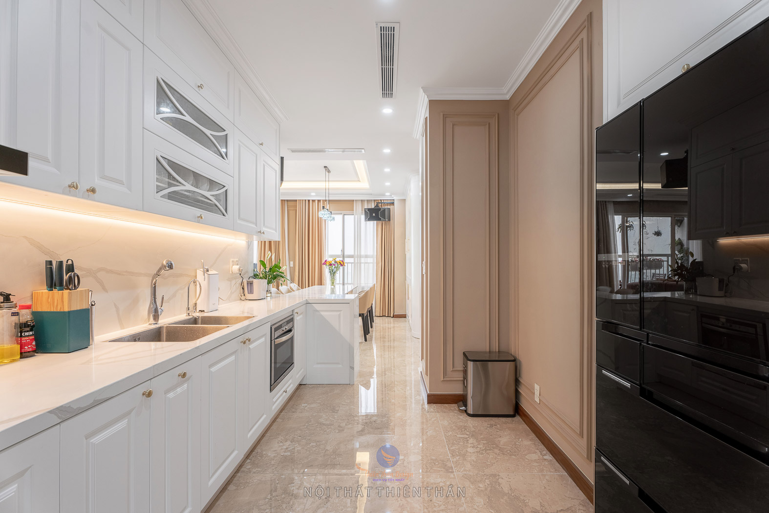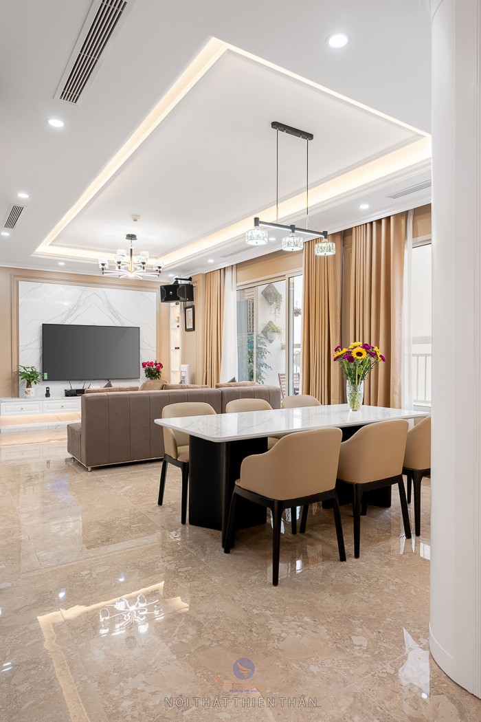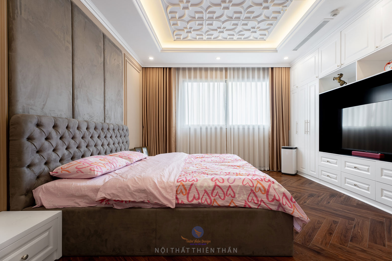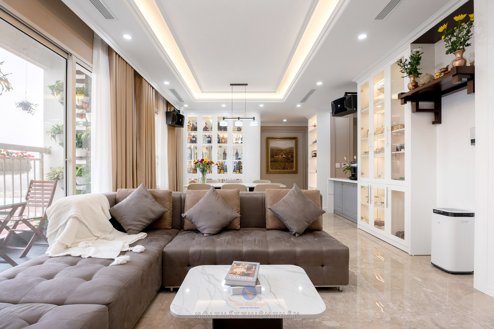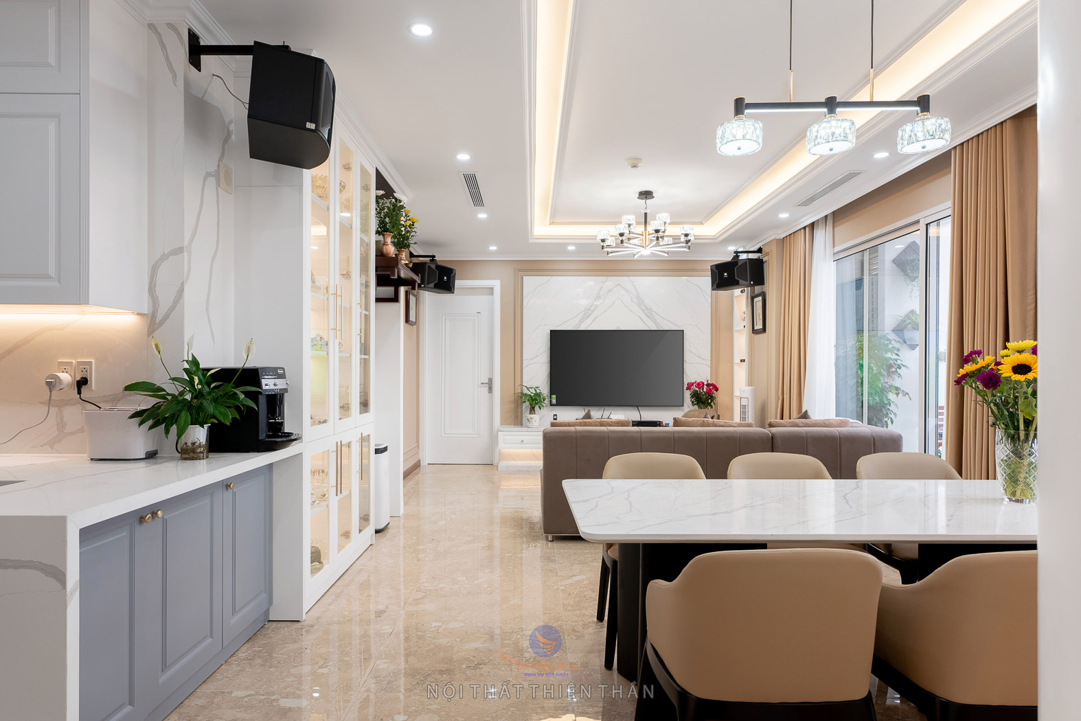 Căn hộ có diện tích 128m2 chia làm 3 phòng ngủ được KTS của Nội Thất Thiên Thần sửa đổi cải tạo làm mới từ đầu từ phần thô đến hoàn thiện nội thất. Phong cách được lụa trọn là bán cổ điển là sự kết hợp giữa nét hiện đại và sự tinh tế của những chi tiết cổ điển đã tạo nên không gian đẹp và đẳng cấp.